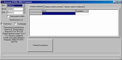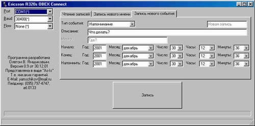 Вторая программа — ObexConnect. Собственно это программа чтения и записи календаря и телефонной книги. Программа инициализирует COM-порт, считывает/записывает данные и закрывает порт. Но остается на экране. То же происходит при создании новой записи в телефоне: открывается порт, записываются данные и COM-порт закрывается.