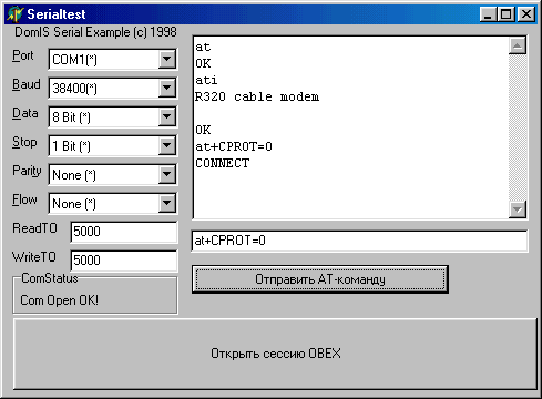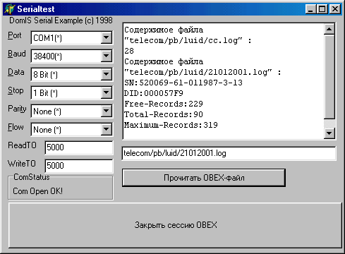 По описанным выше командам и откликам на них были написаны две программки. Первая — ObexReader предназначена для чтения объектов из телефона. Работает она просто: после запуска вы отдаете команды в окне терминала и просматриваете отклики на них. После подачи команды AT*EOBEX или AT+CPROT=0 и получения отклика «CONNECT» нажатие на клавишу «Открытие сессии OBEX» отправляет на телефон команду 80h, и назначение клавиш меняется. Теперь в строке команды можно вводить и читать имя файла, а командой «Закрытие сессии OBEX» закрыть сессию. В архиве, на который указывает ссылка, находятся исходный текст программы и исполняемый файл. Относительно упомянутой раньше программы работы с SMS — в разработанных программах работы с OBEX-протоколом переделан модуль Serial.Pas, который теперь получает в качестве параметров не строки, оканчивающиеся нулевым байтом, а обычные строки с любыми символами. Программа ObexReader держит открытым COM-порт все время, пока работает.
