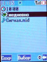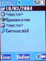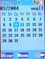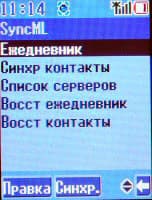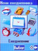 В меню Ежедневник собраны утилиты делового назначения, соответствующее вложенное меню также оформлено наподобие главного. Здесь находится календарь-органайзер, имеющий только ежемесячное отображение и позволяющий программировать напоминания различной периодичности. Пункт Синхронизация позволяет синхронизировать данные телефона и удаленного сервера через GPRS-сеть посредством SyncML, можно раздельно синхронизировать данные календаря и контакт-листа. Будильник позволяет запрограммировать четыре сигнала, каждый из которых может быть однократным или повторяться ежедневно. Расположенный здесь же диктофон позволяет записывать 20-секундные ролики, он может регистрировать также телефонный разговор, включая голос собеседника. В последнем случае его можно вызвать через контекстное меню разговора, либо при помощи боковой кнопки. Завершают список деловых апплетов калькулятор, конвертер валют и окно для создания собственной «визитки» в формате адресной книги телефона. Из меню ежедневника можно также напрямую попасть в адресную книгу и режим приема данных через ИК-порт.
