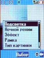 Как и следовало ожидать, по этим командам на экран сразу выводится окно видоискателя. В этом режиме горизонтальным отклонением джойстика можно быстро управлять контрастностью картинки, а вертикальным — задействовать цифровое увеличение. С помощью левой софт-клавиши вызывается меню опций съемки. В первую очередь следует упомянуть возможность включения подсветки — служебный индикатор на лицевой панели рядом с объективом представляет собой достаточно мощный светодиод и может работать в качестве лампы подсветки, как это происходит в Samsung SGH-X600. Яркость его свечения, конечно, поменьше, но в ряде случаев и этого хватает, чтобы повысить качество снимка. Далее, возможна съемка в ночном режиме, с применением эффектов сепии, монохромной съемки, негатива, с автоматическим наложением художественной рамки. Здесь же можно установить формат файла фотографии (PNG, JPEG с различными степенями сжатия) и выбрать режим съемки (одиночный кадр, серия, съемка с таймером, срабатывании затвора от звукового сигнала). Наиболее интересна последняя опция, она позволяет снимать групповой автопортрет с некоторого расстояния, правда, при этом придется обеспечить достаточно высокую громкость сигнала; практическая полезность этой опции невелика, но для развлечения она вполне сгодится.