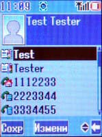 Список записей адресной книги можно вызвать (при настройках по умолчанию) нажатием левой софт-клавиши. Таким образом, можно увидеть только контакты, хранящиеся в памяти телефона, информация с SIM-карты в этот список не попадает. Отсюда же можно просмотреть детали для выбранного контакта, позвонить по одному из номеров или отправить сообщение, передать контакт через Bluetooth или IrDA, скопировать его на SIM. Более сложные операции проводятся по команде из главного меню — здесь можно перераспределить контакты по группам, изменить их параметры, отредактировать настройки адресной книги (главным образом, параметры сортировки и отображения записей, включающих имя и фамилию), запрограммировать метку голосового набора и просмотреть телефонную книгу SIM-карты.