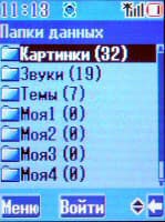 Меню Папки данных скрывает в себе файловый броузер. Память X70 разделена на папки, предустановленны Картинки, Звуки и Темы, дополнительно предусмотрены еще 5 пользовательских, добавлять новые или удалять существующие нельзя.