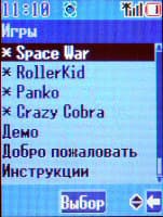 Меню Игры говорит само за себя. Телефон содержит игры на платформе In-Fusio, но здесь нет возможности их установки пользователем, прединсталлированный набор сохраняется в телефоне навсегда, по крайней мере, до изменения прошивки. В нашем аппарате были скроллинговая аркада-леталка Space War, такой же скроллинговый аркадный симулятор роллера (ездока на роликовых коньках) Roller Kid, головоломка Panko, в которой нужно передвигать ящики на указанные места в лабиринте, а также всем известная «змейка» Crazy Cobra. Все игры оказались достаточно интересными и играбельными, жаль, что их состав неизменен.