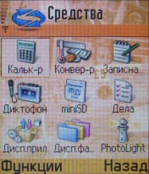 Средства. Здесь располагаются: калькулятор, конвертер величин и валют, блокнот, диктофон, управление картой памяти, список задач, диспетчер приложений, файловый менеджер, утилита PhotoLight. Все апплеты за исключением последнего, стандартны для Series 60, PhotoLight же позволяет произвольно включать и выключать подсветку, используя телефон как фонарик.
