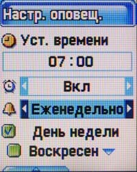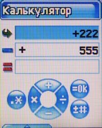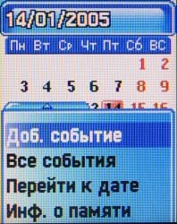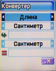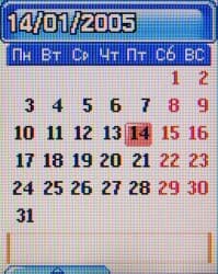 Органайзер — в этом пункте меню открывается доступ к списку напоминаний, календарю, блокноту, калькулятору, конвертору физических величин и секундомеру. Напоминания — это фактически сигналы будильника, их можно задавать множество, для каждого программируется время срабатывания, периодичность (однократное, ежедневное, еженедельное с указанием дней, когда должен звучать сигнал оповещения). Календарь в телефоне скрывается под названием Планировщик; он позволяет просматривать только ежемесячную таблицу дат. Календарь позволяет программировать напоминания, в каждом случае указывается тип (встреча, поездка, ресторан, вечеринка, день рождения), упреждение сигнала оповещения и периодичность события. Количество возможных напоминаний составляет всего 50, чего явно недостаточно. Конвертор величин позволяет преобразовывать единицы длины, площади, объема и веса. Секундомер отображает только одно показание времени, но в отсчете можно делать паузу.