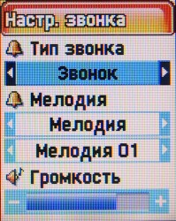 Меню Звук позволяет настроить звуковые сигналы — как мелодии вызова, так и звуковое сопровождение различных событий. Здесь не совсем удобным оказалось раздельное управление звуками нажатия клавиш и перемещения в меню — чтобы заставить телефон работать бесшумно, недостаточно отключить первый звук, нужно не забыть и о втором.