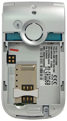 Батарейный отсек закрывается отдельной крышкой, а батарея под ним крепится к корпусу телефона с помощью выступа динамика и защёлки.