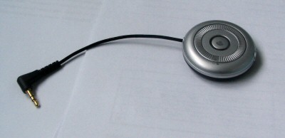 Для начала кратко опишем сам трансивер. Это небольшой серебристый диск, на верхней поверхности которого расположена кнопка соединения с гарнитурой, вокруг нее — кольцевой светодиодный индикатор, еще ближе к внешнему краю — выключатель в виде узкого рифленого кольца, поворачивающегося на небольшой угол.