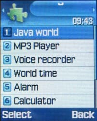 Java world — доступ к Java-программам, установленным в телефоне. В телефоне предустановленно три игры — это трехмерная аркадная «леталка» ArchAngel, платформенная аркадная игра Forgotten warrior, а также «симулятор пенальти» Freekick. Все игры выполнены на весьма высоком уровне, а первые две обладают еще и очень неплохой играбельностью, так что достаточно интересны.