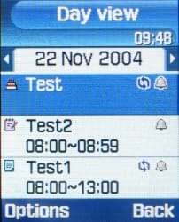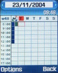 Меню Organizer открывает доступ к календарю-органайзеру. В D500 этот элемент в значительной мере доработан, теперь календарь, как и в большинстве классических бизнес-телефонов, может просматриваться в ежемесячном, еженедельном и еже дневном режимах. Общее количество напоминаний увеличено до 400, при этом они по-прежнему могут быть четырех видов (Schedule — напоминание, Anniversary — годовщина, напоминание срабатывает раз в год, To do — задача, запись включает отметку о выполнении, Miscellaneous — разные напоминания). В новой версии платформы сняты частные ограничения на количество напоминаний каждого вида — напомним, еще в модели E800 можно было сохранить по 25 напоминаний каждого вида (всего 100), теперь же соотношение количества заметок может быть произвольным.