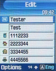 Телефон оборудован расширенной адресной книгой, рассчитанной на хранение 1000 записей. Каждая из них подписывается именем и фамилией абонента, которые заносятся раздельно в два разных поля. Фамилия (Last name) заносится первой, по ней происходит сортировка записей в адресной книге. Далее можно внести 3 номера телефона (мобильный, домашний, рабочий), номер факса, еще один номер (поле Etc ), адрес e-mail, индивидуальную мелодию звонка, картинку, выводимую на экран при входящем вызове, принадлежность к группе и текстовое примечание (сюда можно внести, к примеру, почтовый адрес). Записи из памяти телефона и SIM-карты выводятся в едином списке. Есть несколько дополнительных приятных мелочей, среди которых — выбор действия по умолчанию при сохранении нового контакта.