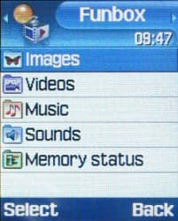 Пункт Funbox содержит броузеры фотоизображений, видеороликов, MP3-файлов, мелодий звонка, а также апплет для определения степени загрузки памяти данными различных типов. В каждом случае выделенный файл можно просмотреть или проиграть с помощью соответствующей программы, которая вызывается автоматически.