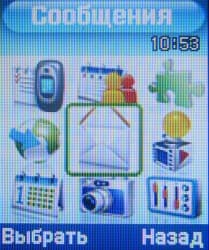 Главное меню представляет собой двухмерную матрицу пиктограмм размером 3×3, навигация в которой выполняется с помощью джойстика. Встроенная клавиша в центре кнопки-джойстика выполняет функцию подтверждения (OK), но для вызова меню, как это бывает в телефонах европейской школы, не применяется. И в главном, и во вложенных меню (текстовых, одномерных, часто оформленных как контекстные, всплывающие на фоне предыдущего окна) работает быстрое управление при помощи цифровых клавиш.