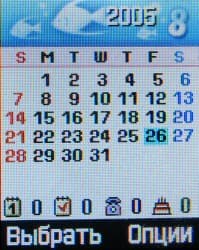 В меню Органайзер собраны утилиты делового назначения. Календарь имеет только ежемесячный режим отображения, в нем есть удобный индикатор общего количества активных событий — они отображаются прямо под массивом дат в виде цифр возле четырех пиктограмм, соответствующих четырем основным типам событий. К сожалению, память органайзера ограничена 25 событиями каждого типа, что может оказаться недостаточно как в отношении общего количества, так и соотношения. Далее здесь присутствуют: список задач, часы мирового времени и будильник. Последний позволяет программировать три разных повторяющихся напоминания, для каждого из которых задается время и выбираются дни, в которые срабатывает напоминание. При желании для любого сигнала можно задать однократное срабатывание. Для большинства людей такого набора должно быть достаточно. Продолжают список утилит делового назначения калькулятор, мощный конвертор величин (валюта, длина, вес, объем, площадь, температура), таймер обратного отсчета и секундомер.