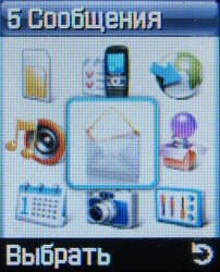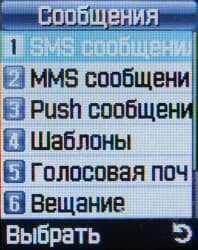 Далее в основном меню следует пункт Сообщения. Телефон поддерживает MMS, в том числе и многостраничные. Предусмотрен ввод букв кириллицы для MMS, SMS и текстовых данных в памяти аппарата. Из меню Сообщения также осуществляется доступ к голосовой почте.