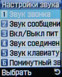 Пункт Настройки звука позволяет устанавливать опции сигналов оповещения, а также звукового сопровождения некоторых событий — включения, установления и конца соединения, получения сообщения. Также в этом меню осуществляется управление виброзвонком. В телефоне не реализован такой тип оповещения, как вибрация одновременно со звуковым сигналом. Это типично для продуктов Samsung, вместо этого режима предлагается пользоваться мелодиями, в которых вибросигнал работает в такт музыке, он управляется одной из дорожек SMAF-полифонии.