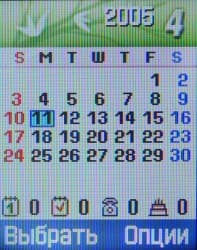 Календарь имеет только ежемесячный режим отображения, в нем есть удобный индикатор общего количества активных событий — они отображаются прямо под массивом дат в виде цифр возле четырех пиктограмм, соответствующих четырем основным типам событий. К сожалению, память органайзера ограничена 25 событиями каждого типа, что может оказаться недостаточно как в отношении общего количества, так и соотношения. Так может возникнуть необходимость запомнить не 25, а 30 годовщин, не пользуясь, скажем, списком задач. В случае если есть общий лимит на количество объектов, это без труда удастся сделать, здесь же ограничение не позволит ввести 5 дополнительных ежегодных напоминаний.