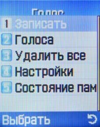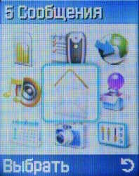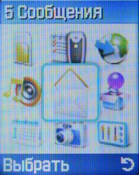 Далее в основном меню следует Сообщения — работа с сообщениями. Телефон поддерживает MMS, в том числе и многостраничные. По умолчанию предоставляется одна страница, однако командой из контекстного меню можно добавить еще; переход между страницами выполняется горизонтальными стрелками. На каждую страницу можно вставить рисунок или фотографию и звуковой файл, для чего в меню предусмотрены команды для непосредственного перехода в соответствующие папки; кроме этого имеются поля темы и текстового сообщения. В телефоне предусмотрен ввод букв кириллицы для MMS, SMS и текстовых данных в памяти аппарата. Из меню Сообщения также осуществляется доступ к голосовой почте.