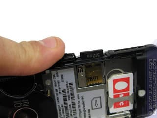 Под аккумулятором располагается удобный слот для крепления SIM-карты, также позволяющий производить её извлечение без помощи ногтей и подручных средств. Рядом со скосом для подцепки аккумулятора расположена белая резиновая заглушка разъёма для подключения внешней антенны. Для её извлечения лучше всего использовать иголку или скрепку.