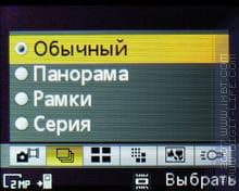 Из настроек доступен выбор режимов съёмки, среди которых имеется: одиночная съёмка, панорама, наложение рамки, а также серийная съёмка четырёх кадров за секунду.