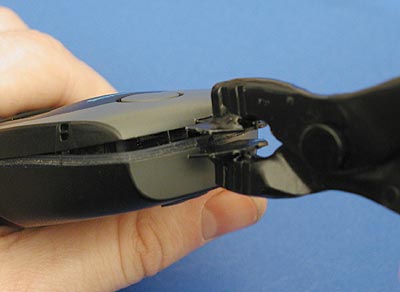Последующие действия достаточно просты. Поскольку из-за достаточной ширины щели перекос губок инструмента в пазе уже исключен, а достаточно большое расстояние между губками делает неэффективным применение отвертки, можно, просто взявшись за ручки, сильно, но аккуратно потянуть их в разные стороны и тем самым добиться открытия верхней пары боковых защелок.