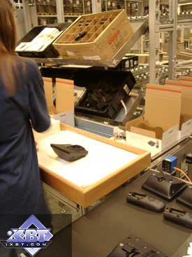 Коробки с зарядными устройствами поступают на небольшую линию, где рабочие вкладывают в них телефоны, тут же запаковываемые в пакетики. Далее собранные комплекты по конвейеру отправляются на последнюю выборочную проверку и складируются. В случае если рабочий ошибется и не вложит, например, инструкцию, коробка вернется обратно, так как на конвейере установлены электронные весы, сравнивающие вес готовых комплектов с нормативным.