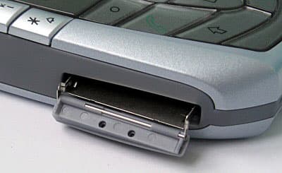 Приятное впечатление производит и конструкция слота для карты памяти. Напомним, что телефон поддерживает только MMC (хотя в слот помещается и SD, по-видимому, конструкторы хотели добавить поддержку и этого формата, но у них не получилось). Гнездо расположено извне корпуса, оно представляет собой подпружиненный металлический лоток с откидной пластмассовой заглушкой. Тем, что карта доступна без выключения и разборки телефона, такая конструкция имеет большое преимущество перед разработками Nokia (3650, 3660, 6600), у которых карта памяти находится внутри аппарата.