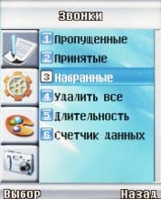 Звонки. В этом пункте организован доступ к спискам совершенных, принятых или пропущенных звонков, а также к счётчикам времени.
