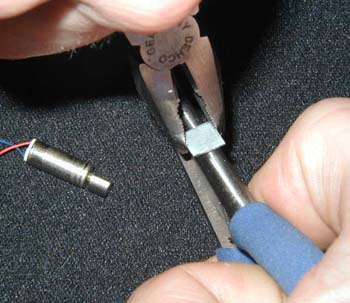 Пластина накладывается на оправку, равную по диаметру грузу виброзвонка, впрочем, я использовал и сам груз. Действовать надо очень осторожно, чтобы случайно не повредить мотор. Пластина обжимается внутренней стороной вокруг оправки (груза) при помощи маленьких плоскогубцев или другого подобного инструмента.