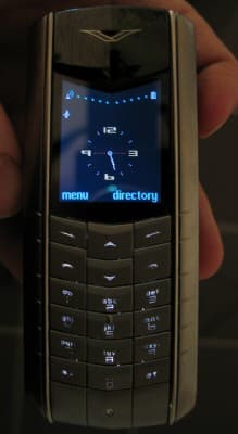 Выглядит телефон весьма солидно. Не большой и не маленький (108×43×21,5 мм), он, тем не менее, достаточно тяжелый — 173 грамма. Однако тяжесть эта приятная, аппарат лежит в руке как влитой, его удобно держать. Лицевая панель устройства выполнена из сплава, клавиши — из нержавеющей стали. Дисплей, средний по размерам, традиционно для Vertu, защищен сапфировым стеклом. Экран имеет разрешение 116×148 пикселей, он цветной, но, сколько оттенков поддерживает, понять не удалось. Осмелимся предположить, что это 4096 цветов. Над дисплеем находится прорезь динамика, выполненная в фирменном стиле Vertu.