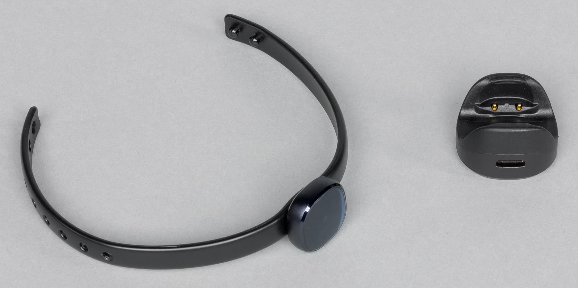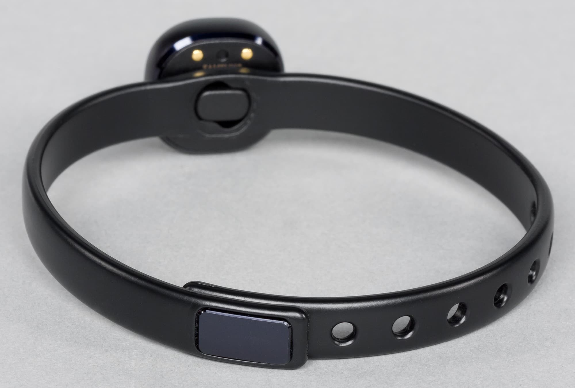 Эта док-станция очень напоминает аналогичные приспособления для Samsung Gear Fit и первых двух поколений часов Samsung Gear. Она надевается на корпус браслета с тыльной стороны таким образом, чтобы совпали два контакта на док-станции и браслете.