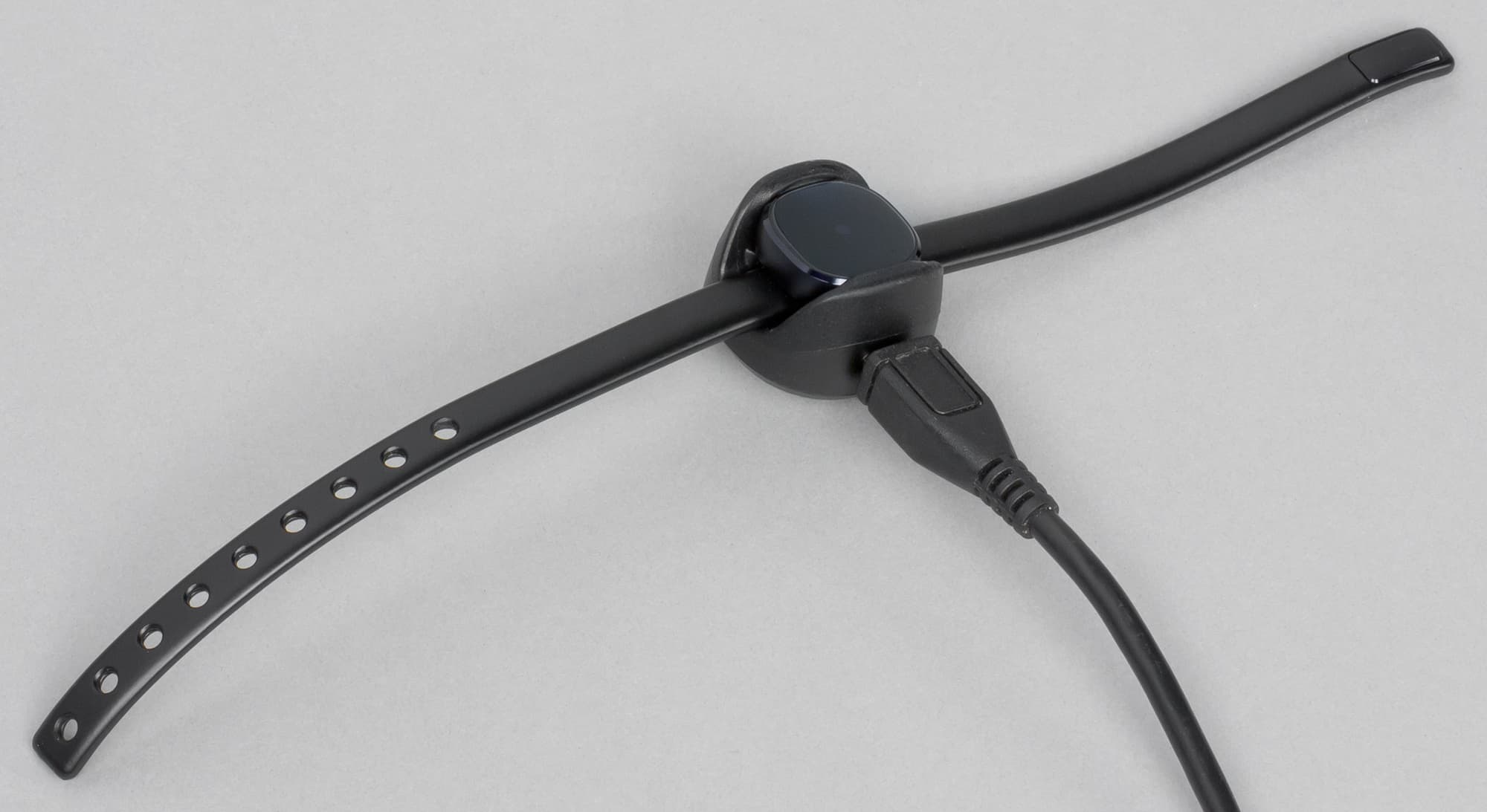 Нижняя часть док-станции выполнена из пластика, а ушки, которые обхватывают корпус браслета — из плотной резины. Когда мы располагаем устройство между ними, они немного расходятся и затем плотно удерживают браслет. Единственный разъем на док-станции — Micro-USB. К нему надо присоединить кабель — и тогда браслет будет заряжаться.