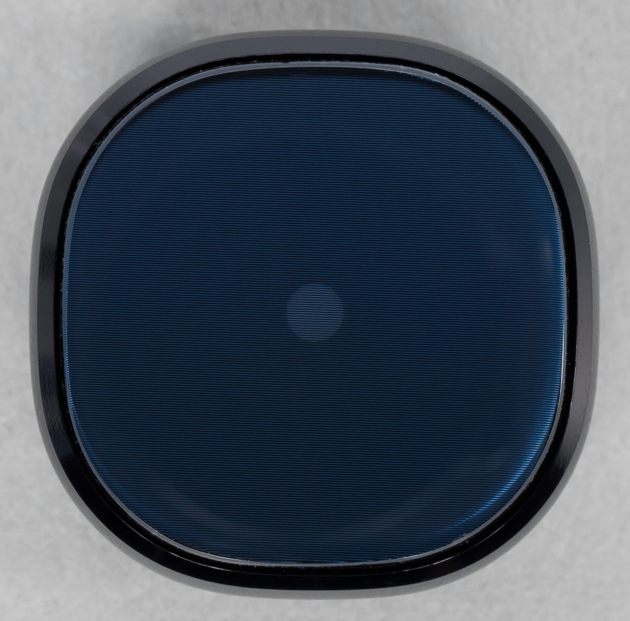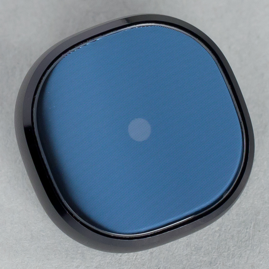 При ярком внешнем свете под стеклом по центру можно заметить кружочек LED-индикатора. Он здесь только один, зато может мигать тремя цветами: синим, зеленым и красным. Красный цвет — во время зарядки, зеленый — когда зарядка завершена, а синий — для уведомлений. На фотографии ниже хорошо виден светодиод, но цвет стекла не такой, как на самом деле — стекло полностью черное.