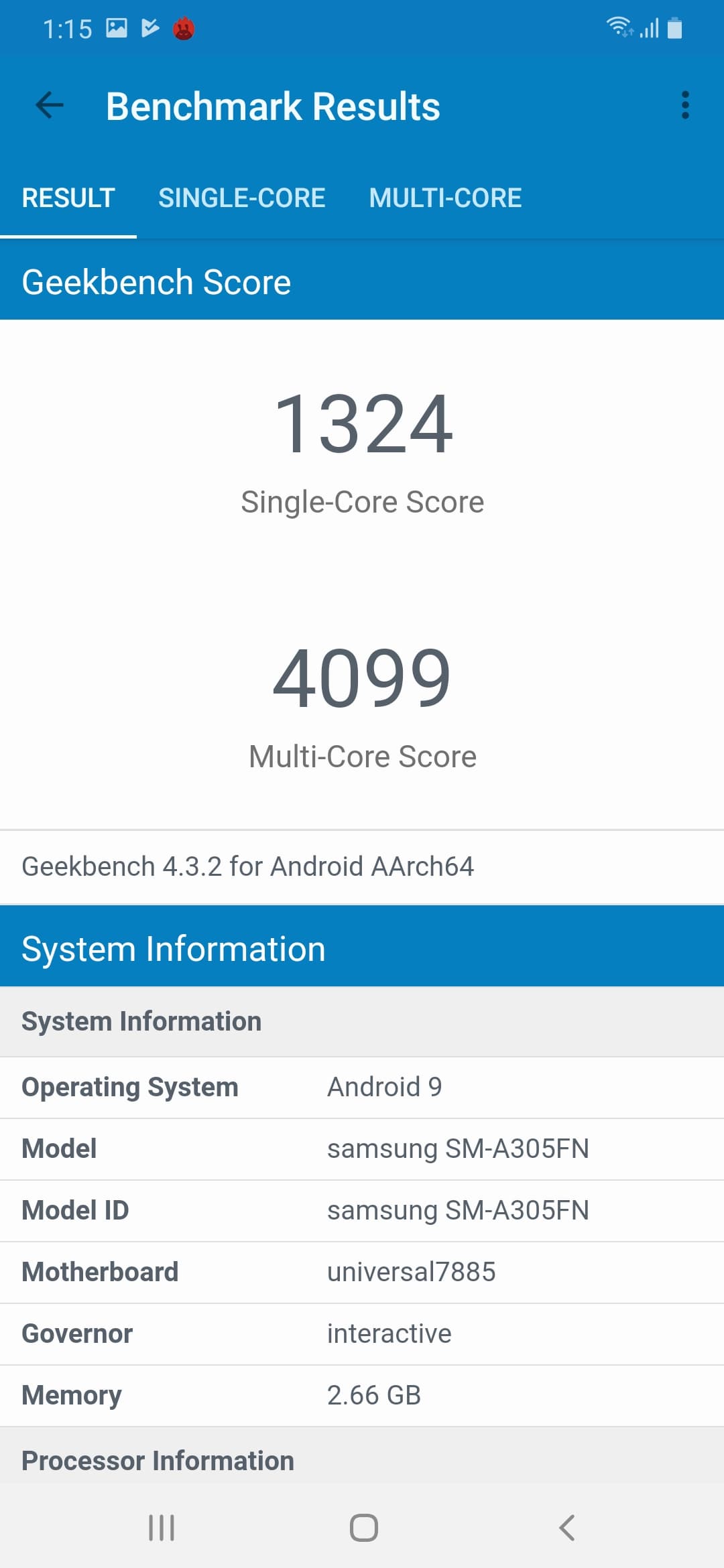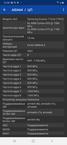 - SoC Samsung Exynos 7904, 8 ядер: 2×Cortex-A73 @1,8 ГГц и 6×Cortex-A53 @1,6 ГГц