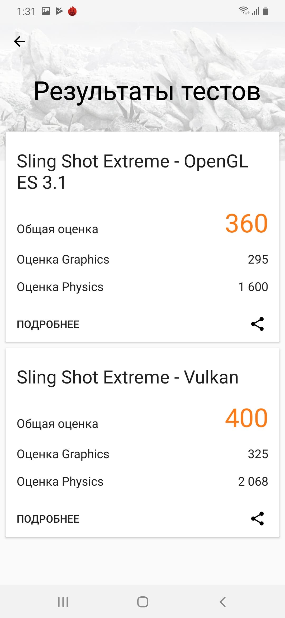 | 3DMark Ice Storm Sling Shot ES 3.1 (больше — лучше) | 360 | 1260 | 827 | 511 | 941 |