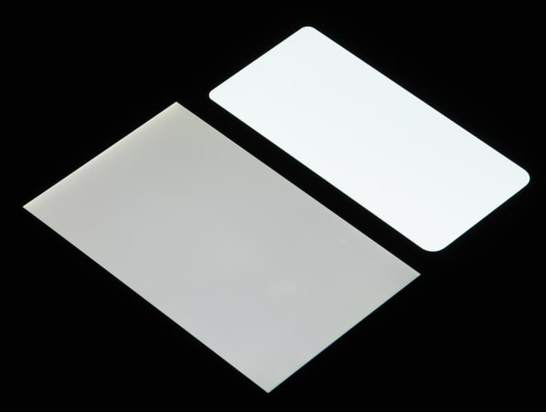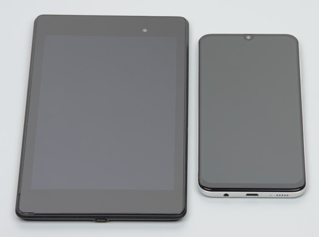 Лицевая поверхность экрана выполнена в виде стеклянной пластины с зеркально-гладкой поверхностью, устойчивой к появлению царапин. Судя по отражению объектов, антибликовые свойства экрана примерно как у экрана Google Nexus 7 (2013) (далее просто Nexus 7). Для наглядности приведем фотографию, на которой в выключенных экранах отражается белая поверхность (слева — Nexus 7, справа — Samsung Galaxy A30, далее их можно различать по размеру):