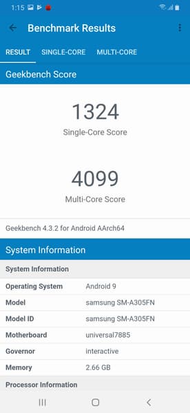 Samsung Exynos 7904 оказалась на удивление слабенькой мобильной платформой, не в пример хуже Exynos 9610 — отличной по соотношению цены и качества среднеуровневой платформы, на которой работает родственный Galaxy A50. Производится эта SoC по техпроцессу 14 нм.