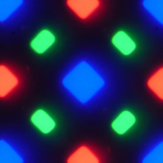 В этом экране используется матрица Super AMOLED — активная матрица на органических светодиодах. Полноцветное изображение создается с помощью субпикселей трех цветов — красного (R), зеленого (G) и синего (B), но красных и синих субпикселей в два раза меньше, что можно обозначить как RGBG. Это подтверждается фрагментом микрофотографии: