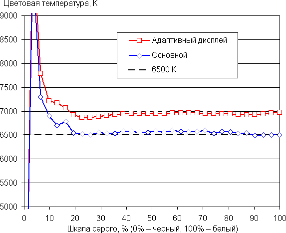 (Самые темные области шкалы серого в большинстве случаев можно не учитывать, так как там баланс цветов не имеет большого значения, да и погрешность измерений цветовых характеристик на низкой яркости большая.)
