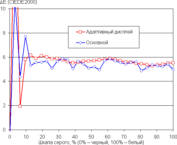Напомним, что в случае OLED-экранов яркость фрагментов изображения динамично меняется в соответствии с характером выводимого изображения — уменьшается для светлых в целом изображений. В итоге полученная зависимость яркости от оттенка (гамма-кривая), скорее всего, немного не соответствует гамма-кривой статичного изображения, так как измерения проводились при последовательном выводе оттенков серого почти на весь экран.