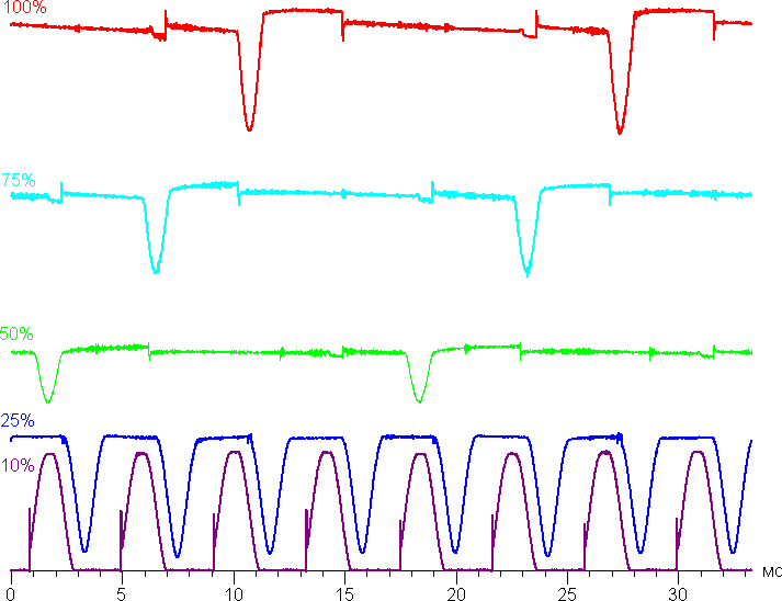 На любом уровне яркости присутствует значимая модуляция с частотой 60 или 240 Гц. На рисунке ниже приведены зависимости яркости (вертикальная ось) от времени (горизонтальная ось) для нескольких значений настройки яркости: