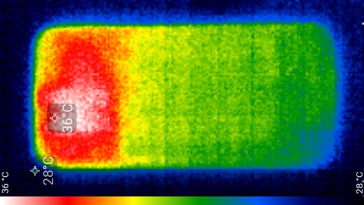 Нагрев выше в верхней части аппарата, что, видимо, соответствует расположению микросхемы SoC. По данным теплокамеры, максимальный нагрев составил 36 градусов (при температуре окружающего воздуха в 24 градуса), это относительно немного.