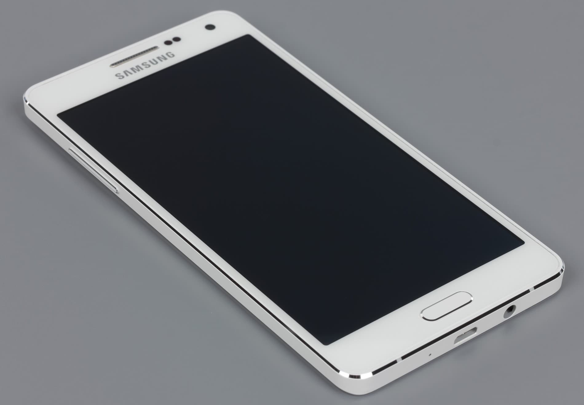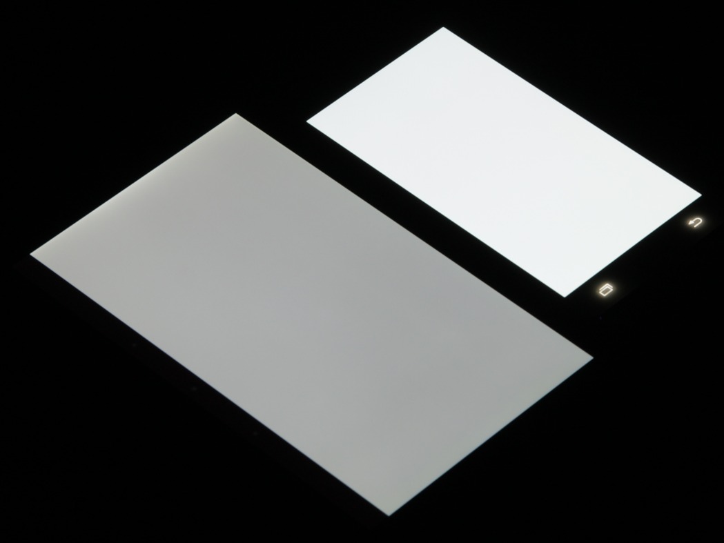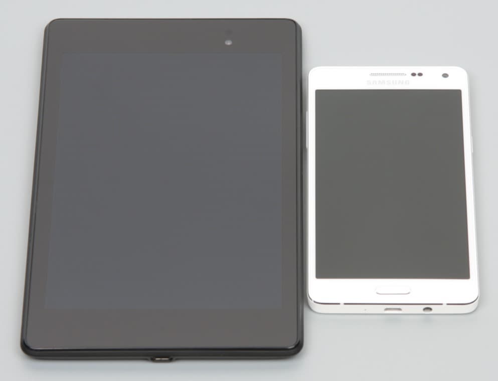 Лицевая поверхность экрана выполнена в виде стеклянной пластины с зеркально-гладкой поверхностью, устойчивой к появлению царапин. Судя по отражению объектов, антибликовые свойства экрана не хуже, чем у экрана Google Nexus 7 (2013) (далее просто Nexus 7). Для наглядности приведем фотографию, на которой в выключенных экранах отражается белая поверхность (слева — Nexus 7, справа — Samsung Galaxy A5, далее их можно различать по размеру):