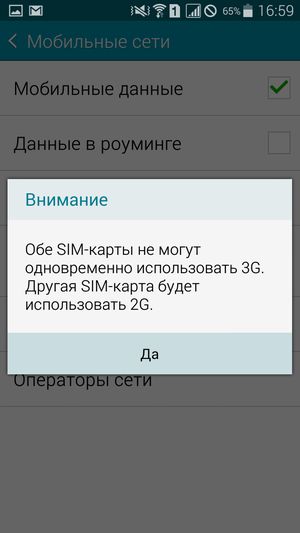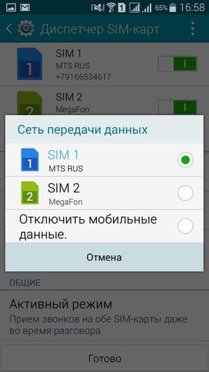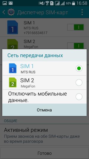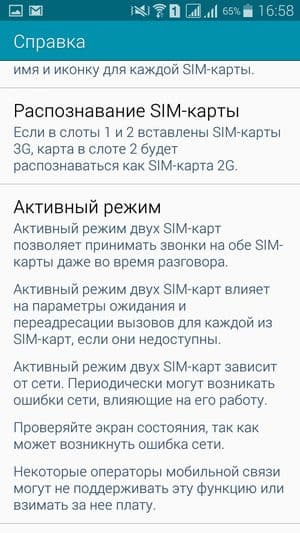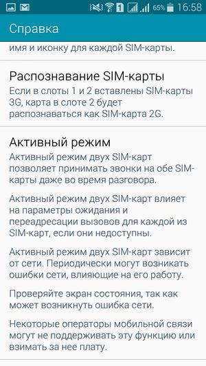 Смартфон поддерживает работу с двумя SIM-картами, и в целом работа с ними в меню организована по знакомому принципу: можно любую из SIM-карт назначить основной для организации голосовых звонков, передачи данных или отправки SMS-сообщений. При наборе номера также можно выбрать желаемую карту, вызвав контекстное меню из меню уведомлений. С сетями 3G (LTE) может работать SIM-карта в любом слоте, однако одновременно в этом режиме может работать лишь одна из карт (вторая будет работать только в 2G). Радиомодуль в аппарате установлен только один, однако здесь реализован стандартный для всех моделей Samsung Duos так называемый «Активный режим», который позволяет принять вызов на вторую SIM-карту при занятой первой. Реализуется это за счет установки перекрестной переадресации номеров обеих карточек друг на друга. Работа активного режима двух SIM-карт основана на таких услугах оператора сотовой связи, как переадресация вызова и ожидание/удержание вызова. После включения режима аппарат предлагает вручную ввести два номера, которые будут переадресованы друг на друга. Для работы функции услуга переадресации обязательно должна быть активирована на обеих SIM-картах. Подробнее о реализации «Активного режима» можно прочитать на сайте производителя.