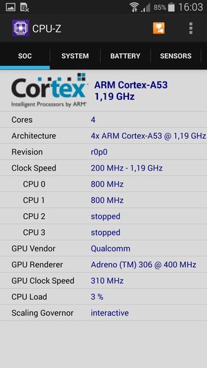 - SoC Qualcomm Snapdragon 410 (MSM8916), 4 ядра ARM Cortex-A53 (64-битных), 1,2 ГГц