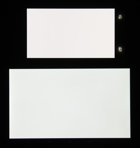 Экран характеризуется великолепными углами обзора, правда белый цвет при отклонении даже на небольшие углы приобретает легкий сине-зеленый оттенок, но черный цвет — просто черный под любыми углами. Настолько черный, что параметр контрастности в данном случае неприменим. При перпендикулярном взгляде равномерность белого поля отличная. Для сравнения приведем фотографии, на которых на экраны Samsung Galaxy A5 (профиль Основной) и второго участника сравнения выведены одинаковые изображения, при этом яркость экранов изначально установлена примерно на 200 кд/м², а цветовой баланс на фотоаппарате принудительно переключен на 6500 К. Белое поле: