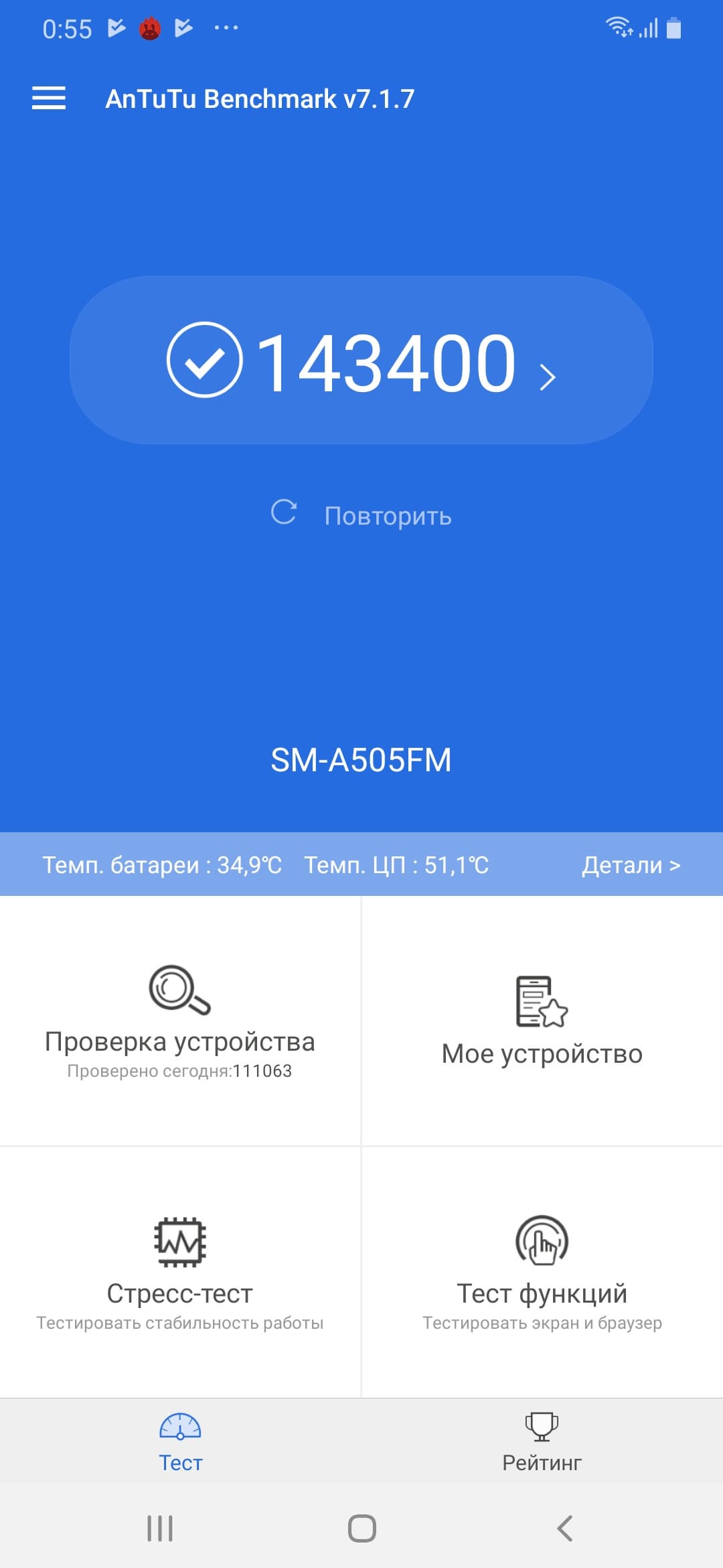 | AnTuTu (v7.x) (больше — лучше) | 143400 | 96889 | 90961 | 160958 | 122309 |