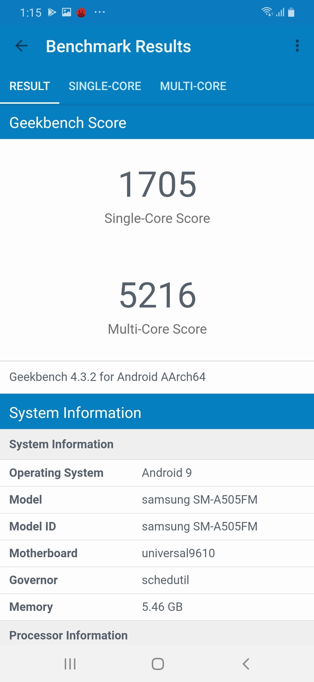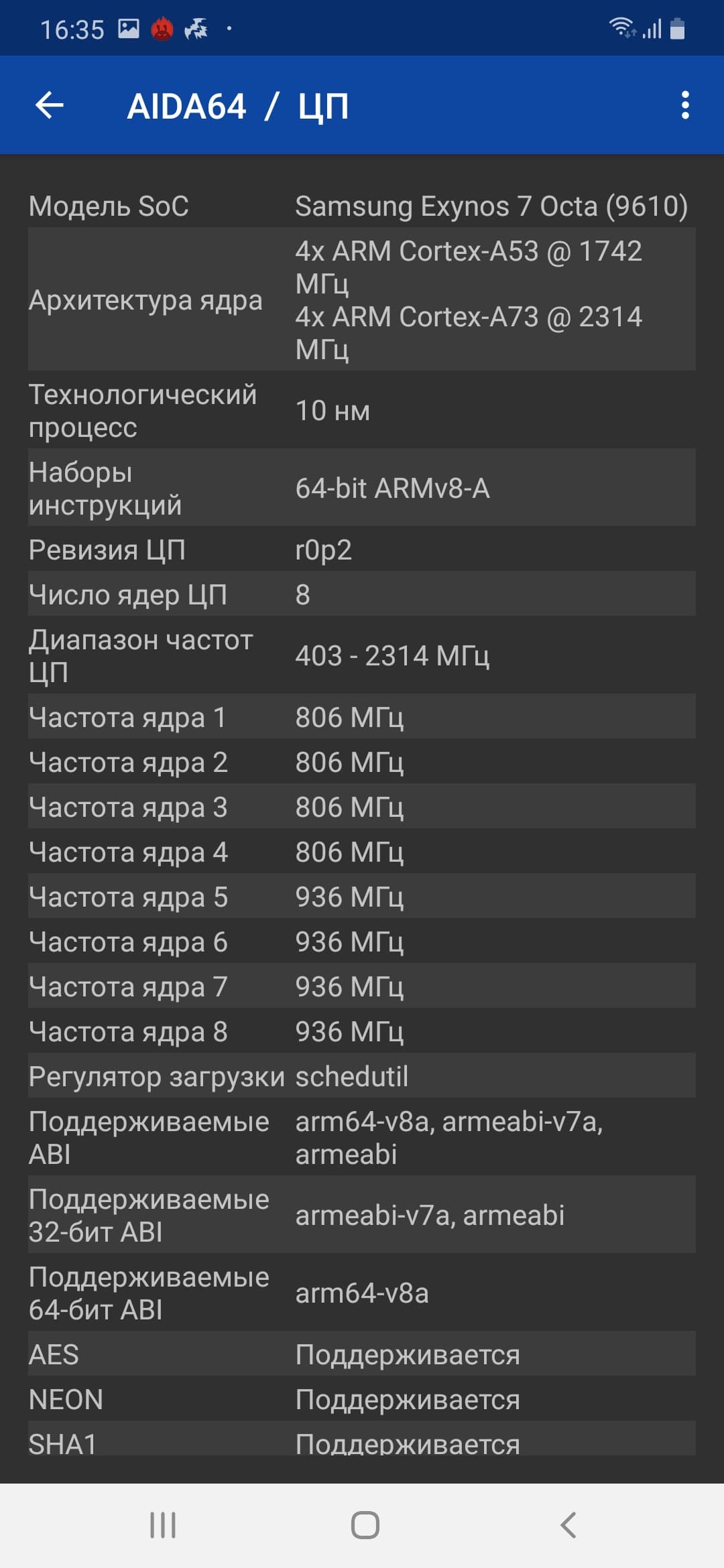 - SoC Samsung Exynos 9610, 8 ядер: 4×Cortex-A73 @2,3 ГГц, 4×Cortex-A53 @1,7 ГГц