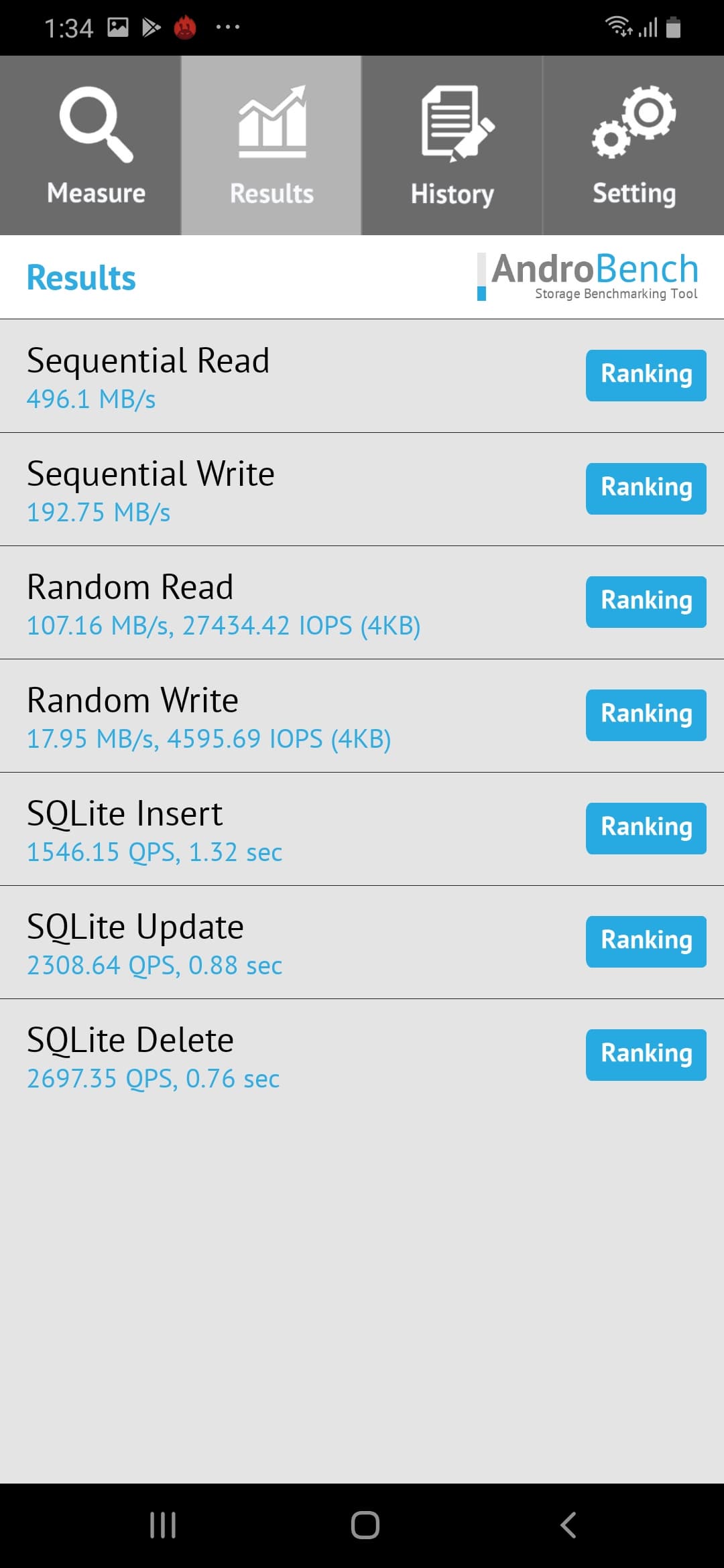 Результаты теста AndroBench на скорость работы с памятью: