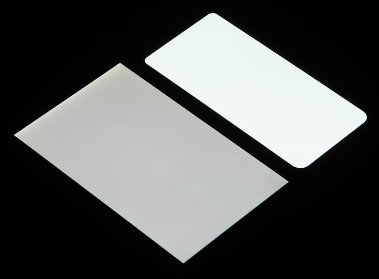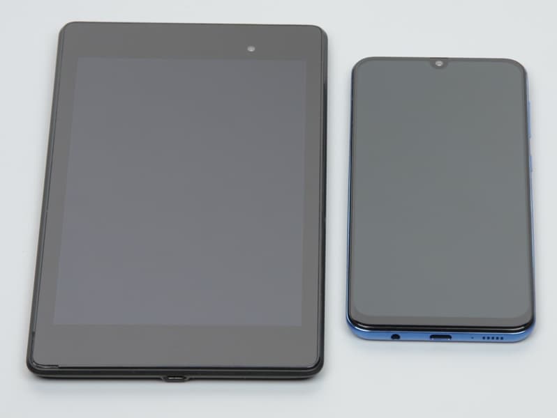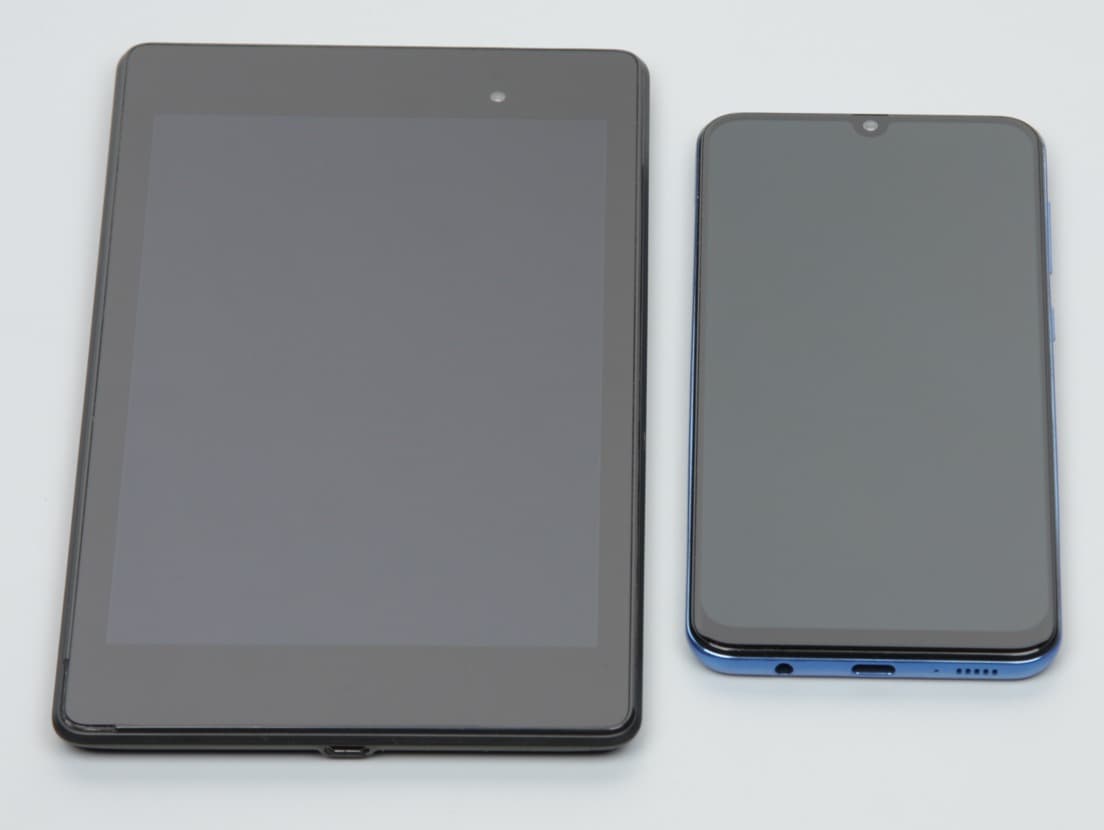 Лицевая поверхность экрана выполнена в виде стеклянной пластины с зеркально-гладкой поверхностью, устойчивой к появлению царапин. Судя по отражению объектов, антибликовые свойства экрана примерно как у экрана Google Nexus 7 (2013) (далее просто Nexus 7). Для наглядности приведем фотографию, на которой в выключенных экранах отражается белая поверхность (слева — Nexus 7, справа — Samsung Galaxy A50, далее их можно различать по размеру):